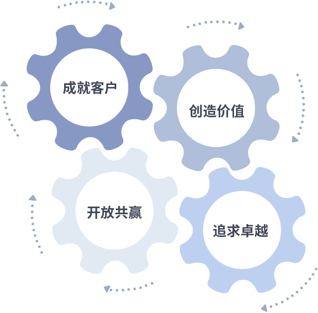 成就客户是一切决策的出发点,,,创造价值是衡量所有工作的标准,,,,追求卓越是我们做事做人的态度,,,,开放共赢是我们的格局也是最终的结果。。。价值观的齿轮环环相扣,,,,推动着组织里的每个人不断向前。。