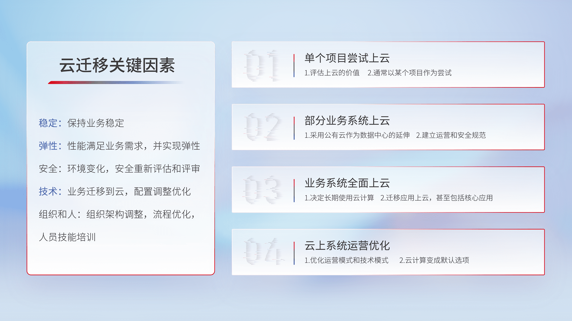 结合实际业务,,从规划设计、、、、云平台选型、、云原生改造、、、、数据迁移、、、、集成交付,,迁移全过程为客户识别最佳上云路径,,做好风险识别管理,,,设计网络架构、、身份权限、、、安全审计合规、、、、操作审计、、日志审计、、、监控告警策略、、多站点容灾设计等,,对云上基础设施进行整体规划,,,,提升IT治理水平,,,,以满足弹性、、高可用、、高性能的需求。。