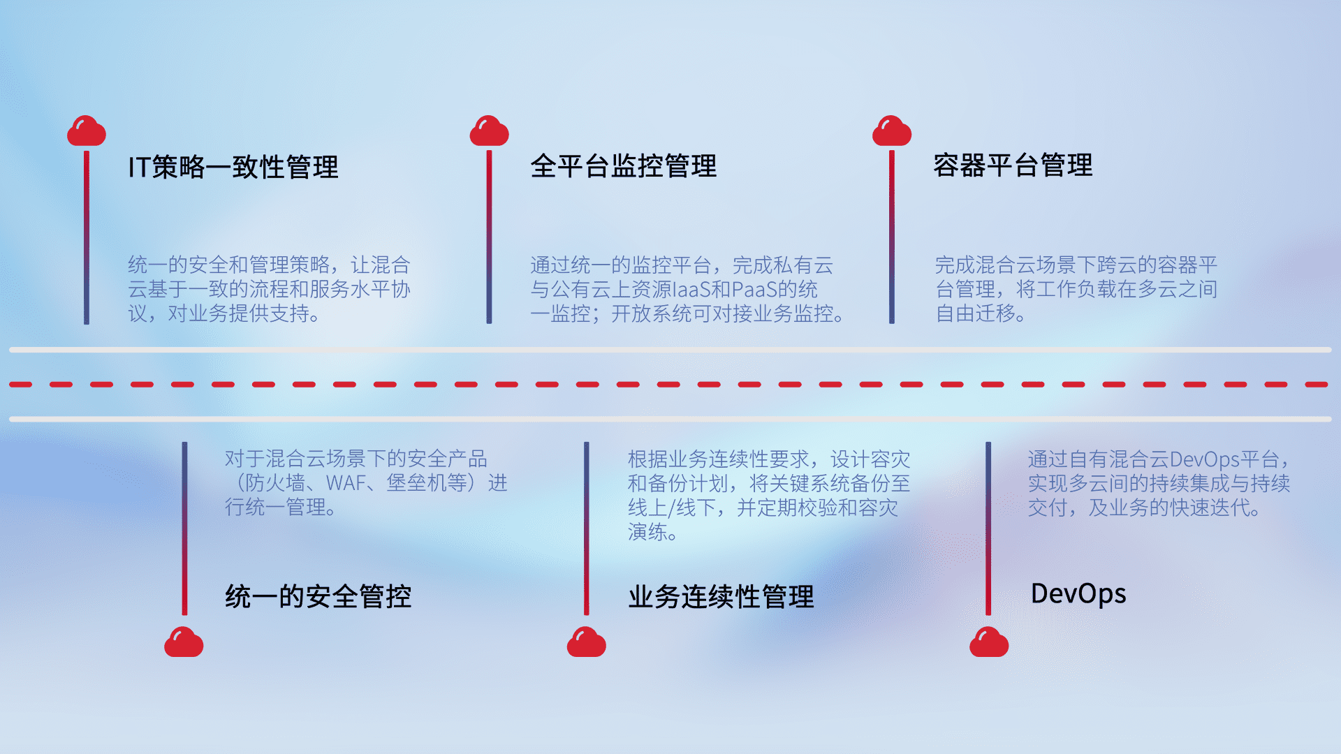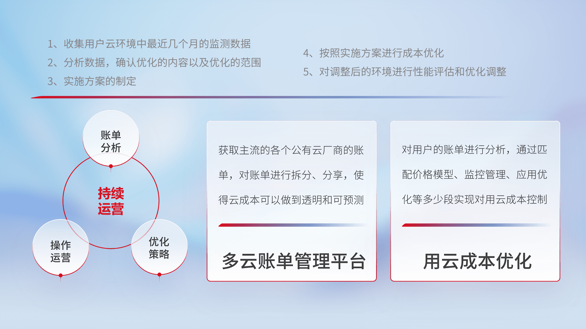 通过多云纳管,,,,以统一的资源数据模型把客户的云资源进行抽象和封装,,进而实现对多云资源的统一操作,,保障云资源管理的可靠性、、、、稳定性与可用性。。。量身定制化运维内容,,,,配置、、、、开发运维、、补丁管理、、、、备份、、、监控、、、、认证和访问管理、、、、审计和日常巡检等,,保障在用云过程中的可靠度,,,稳定度以及高可用率。。